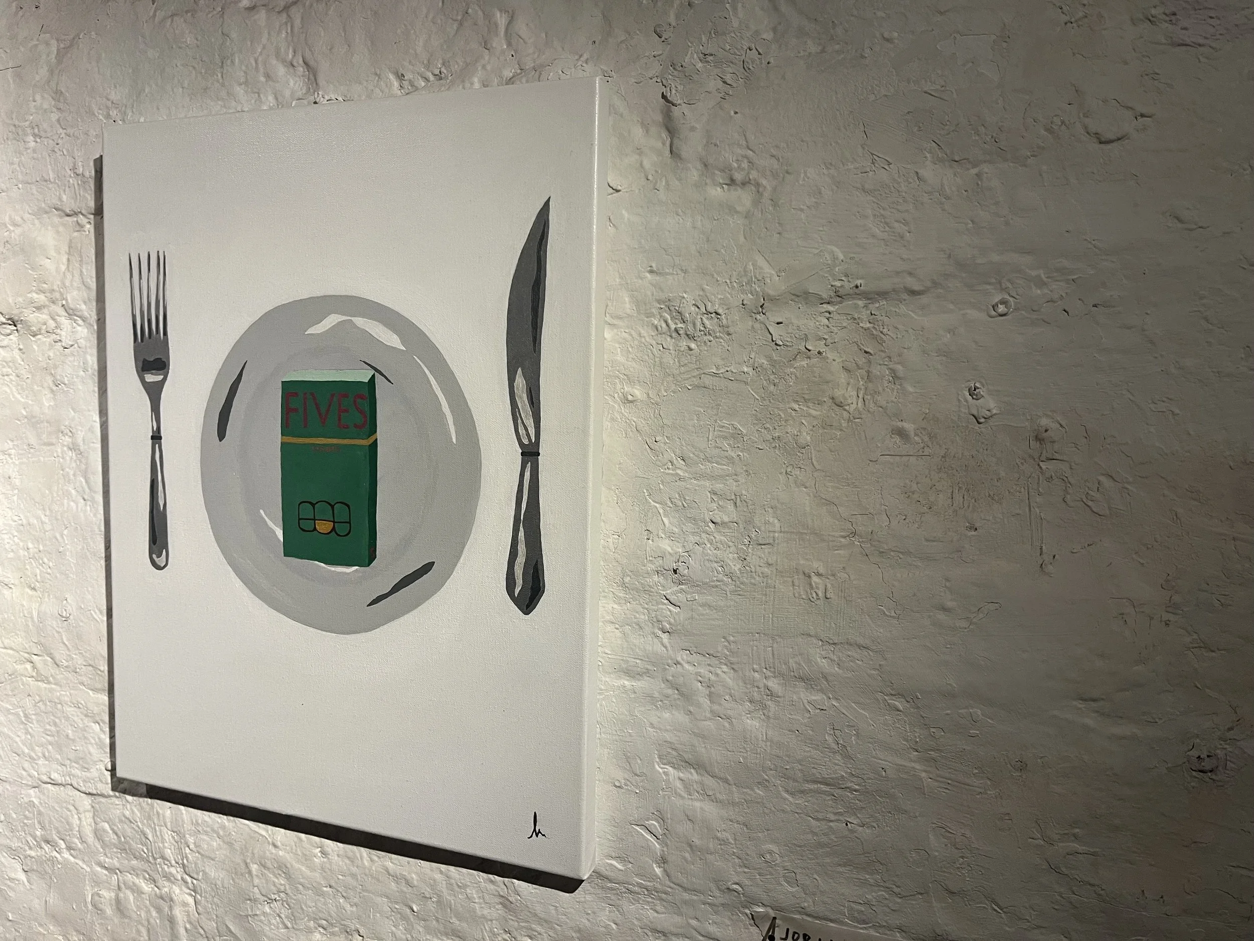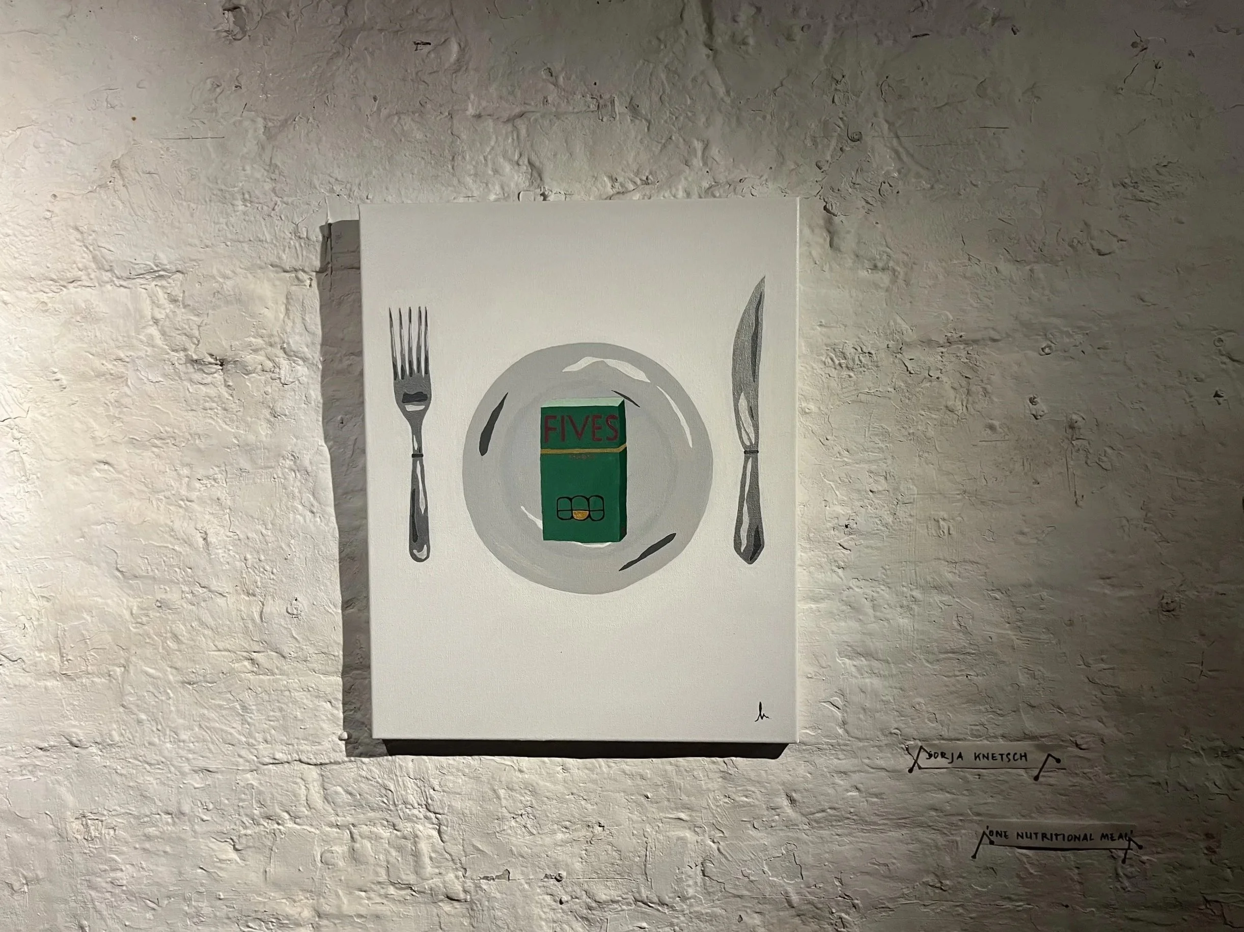 Positioned within the familiar language of consumption, the work depicts a dinner setting reduced to a quiet contradiction: a plate and cutlery offering only a packet of “light” cigarettes. Borrowing the visual codes of nutritional assurance—specifically the green emblem associated with “one of your five a day”—the piece unsettles the authority of what is presented as healthy, truthful, or safe.